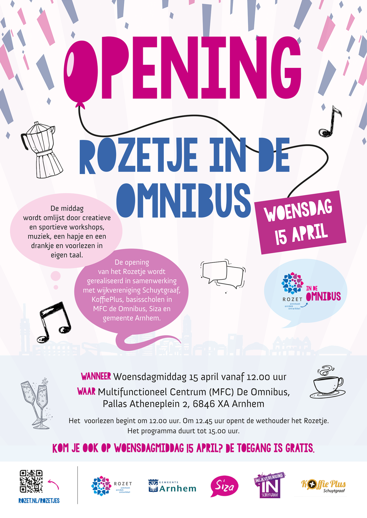 Maar op woensdag 15 april is het zover! Die dag opent om 12:45u de wethouder officieel deze nieuwe locatie. Op dat moment wordt er aan de kleintjes voorgelezen in diverse talen en na het officiële moment zijn er tot 15:00u gratis allerlei creatieve, sportieve en verbindende workshops te beleven voor jong en oud. Uiteraard is er een lekker hapje, een drankje én muziek. Het programma van deze openingsmiddag wordt samengesteld door wijkvereniging Schuytgraaf, de basisscholen, Rozet en ondersteund door Siza. Iedereen is welkom!