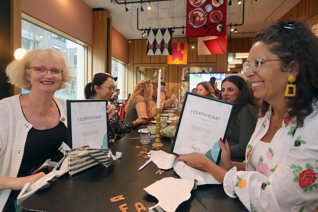 Tijdens de gezamenlijke lunch om de erkenning van het Taalhuis te vieren in de week van Lezen & Schrijven, kregen zowel bestuurders als taalaanbieders allemaal een eigen versie van het kwaliteitscertificaat overhandigd.