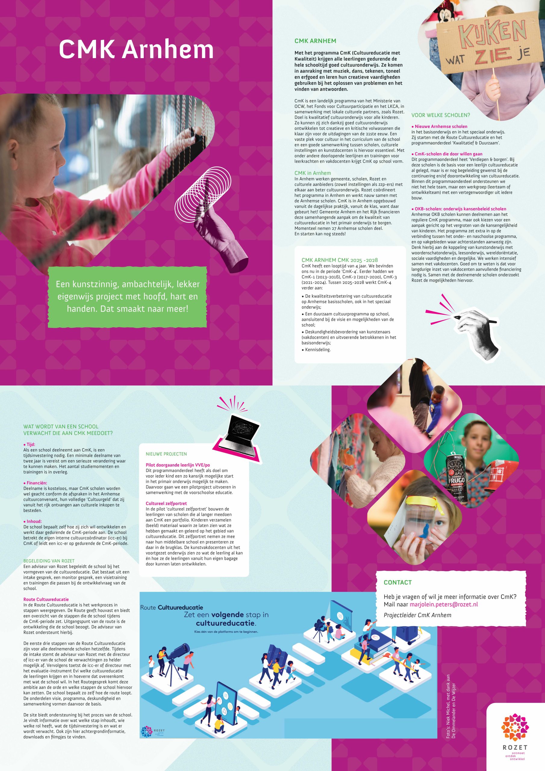 In Arnhem werken gemeente, scholen, culturele aanbieders (zowel instellingen als zzp-ers) en Rozet met elkaar aan beter cultuuronderwijs. Rozet coördineert het programma in Arnhem en werkt nauw samen met de Arnhemse scholen. CmK is in Arnhem opgebouwd vanuit de dagelijkse praktijk, vanuit de klas, want daar gebeurt het! Meer info in de flyer hiernaast!